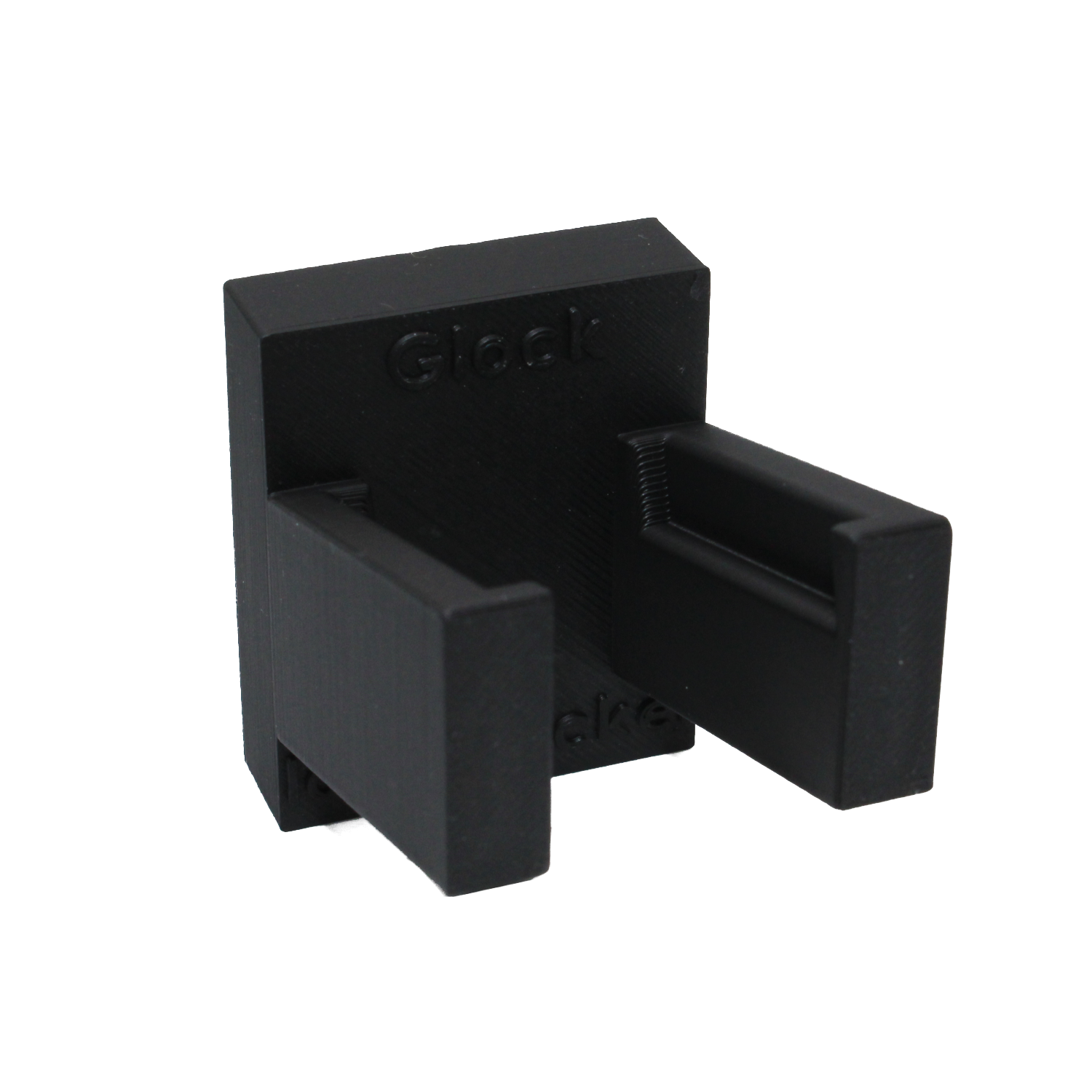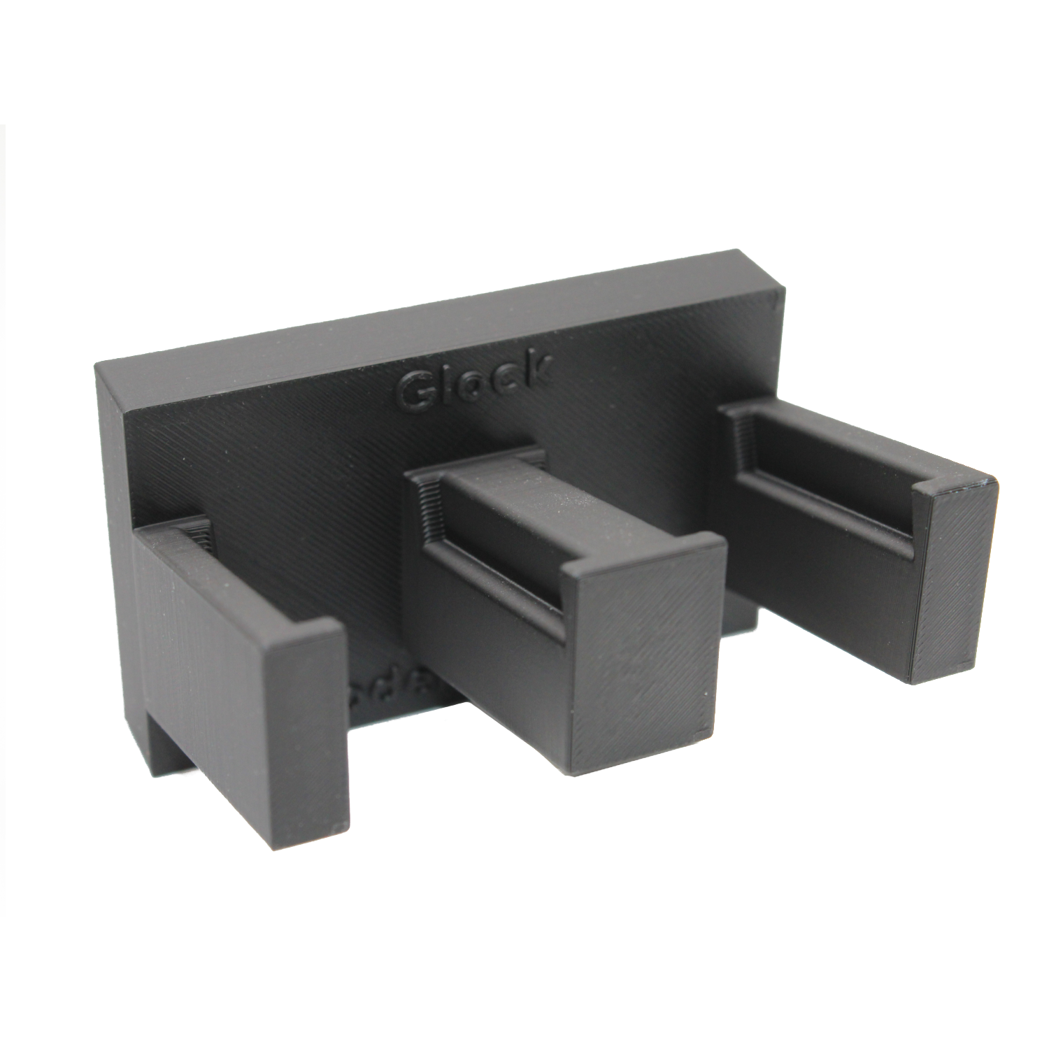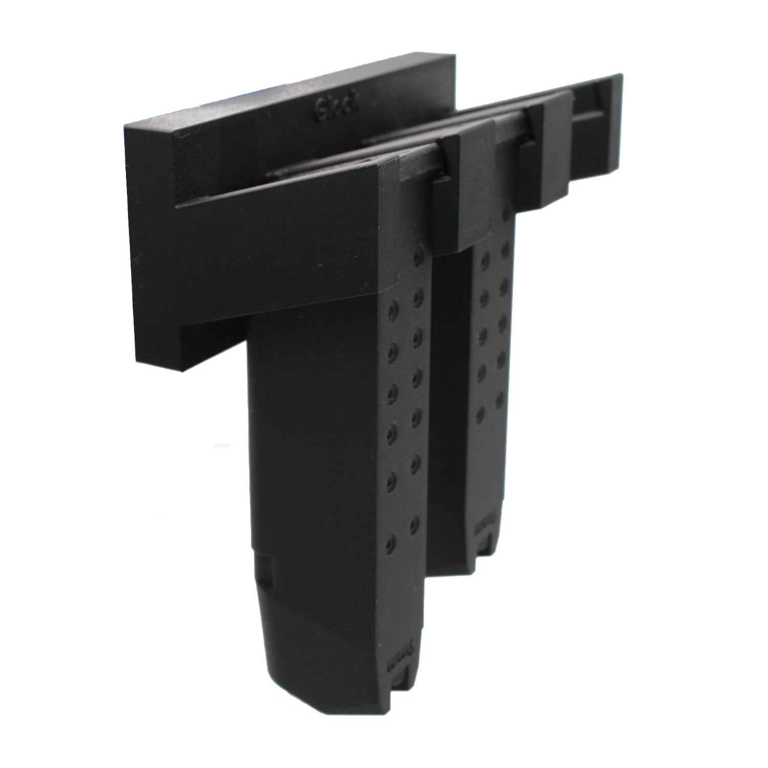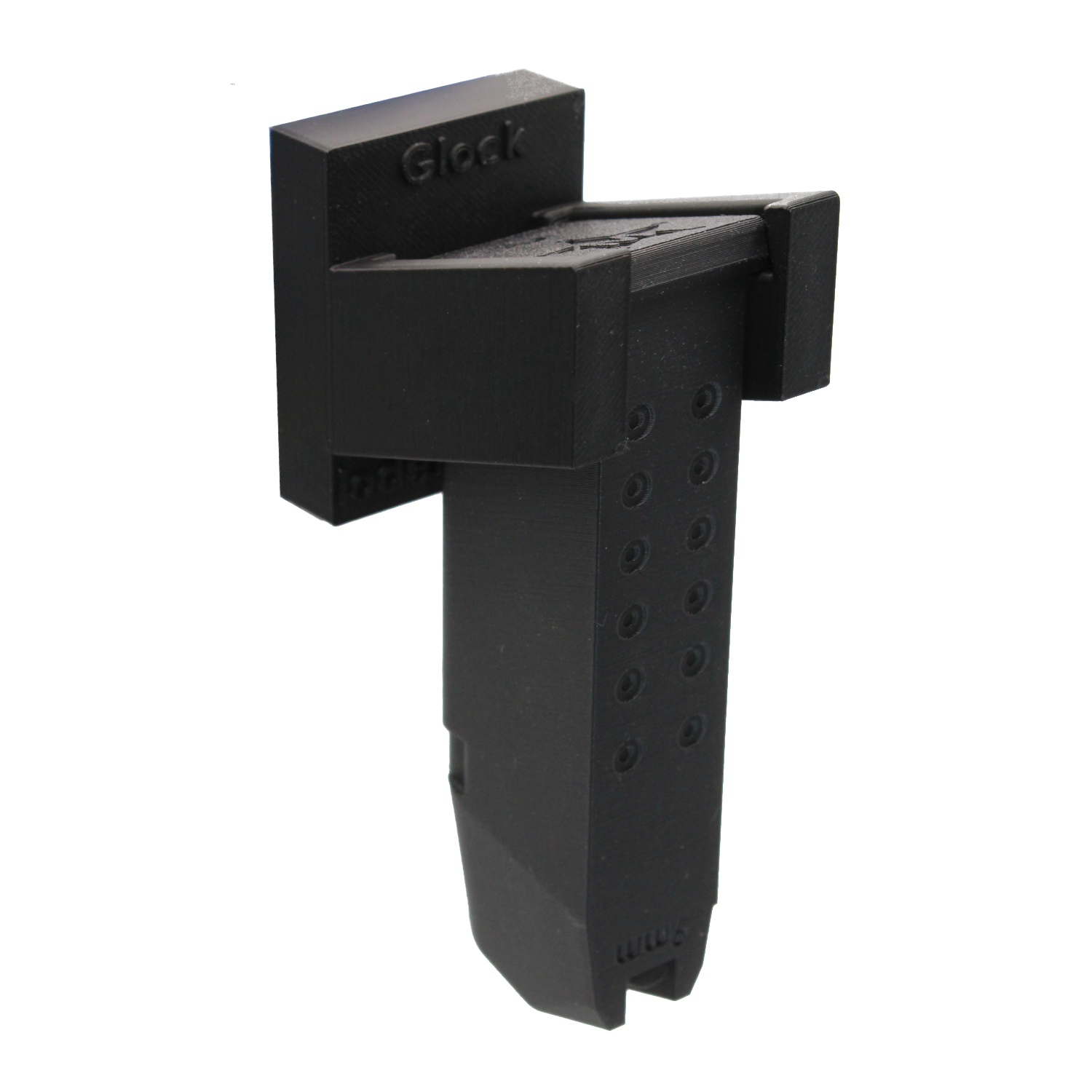 Die Halterung besteht aus einer stabilen Grundplatte mit eingelassenen Magneten und zwei nach vorne schräg aufsteigenden Armen, in die das Glock-Magazin einfach eingehängt wird. Die Konstruktion hält Magazine sowohl geladen als auch ungeladen sicher an Ort und Stelle — selbst wenn die Waffenschranktür zufällt. Die matte Oberfläche fügt sich unauffällig und modern in jeden Waffenschrank ein.